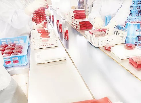 約60年続く工場にて製造され、その工程は14段階にも及びます。こまめに室温や湿度などを厳しく管理する環境のなか、ごく一部の熟練した職人の手によって一つ一つ丹念に磨かれます。まるで500カラットのルビーのような透明感のある石鹸が完成します。さらに。包装前には規定の透明感・重量・色調・外観などを厳しくチェックし、それらをパスした石鹸だけがお手元に届きます。